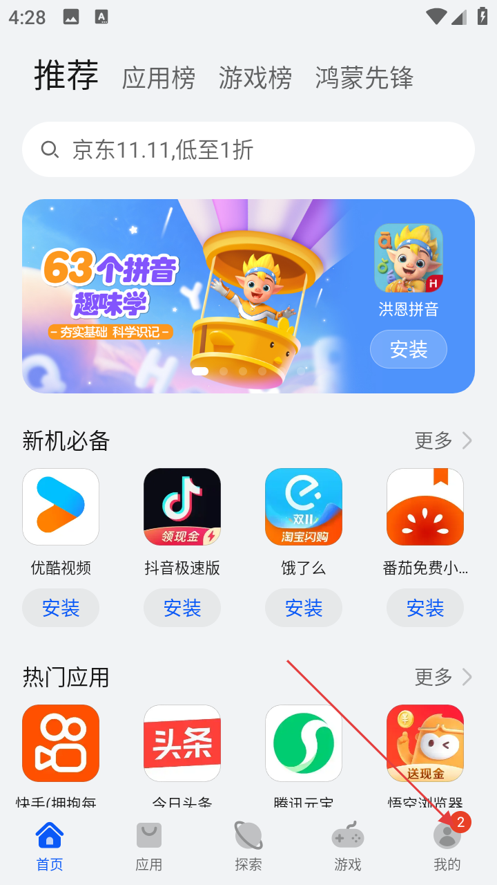 1、在华为应用市场首页,可浏览【推荐】【应用榜】【游戏榜】【鸿蒙先锋】等板块内容,点击【我的】进入个人页面。
