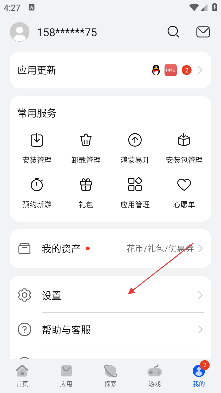2、在【我的】页面,点击【设置】进入设置界面,还能查看应用更新、常用服务、我的资产等功能。