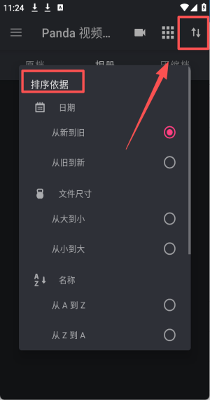 4、点击右上角菜单图标,选择“排序依据”管理文件。