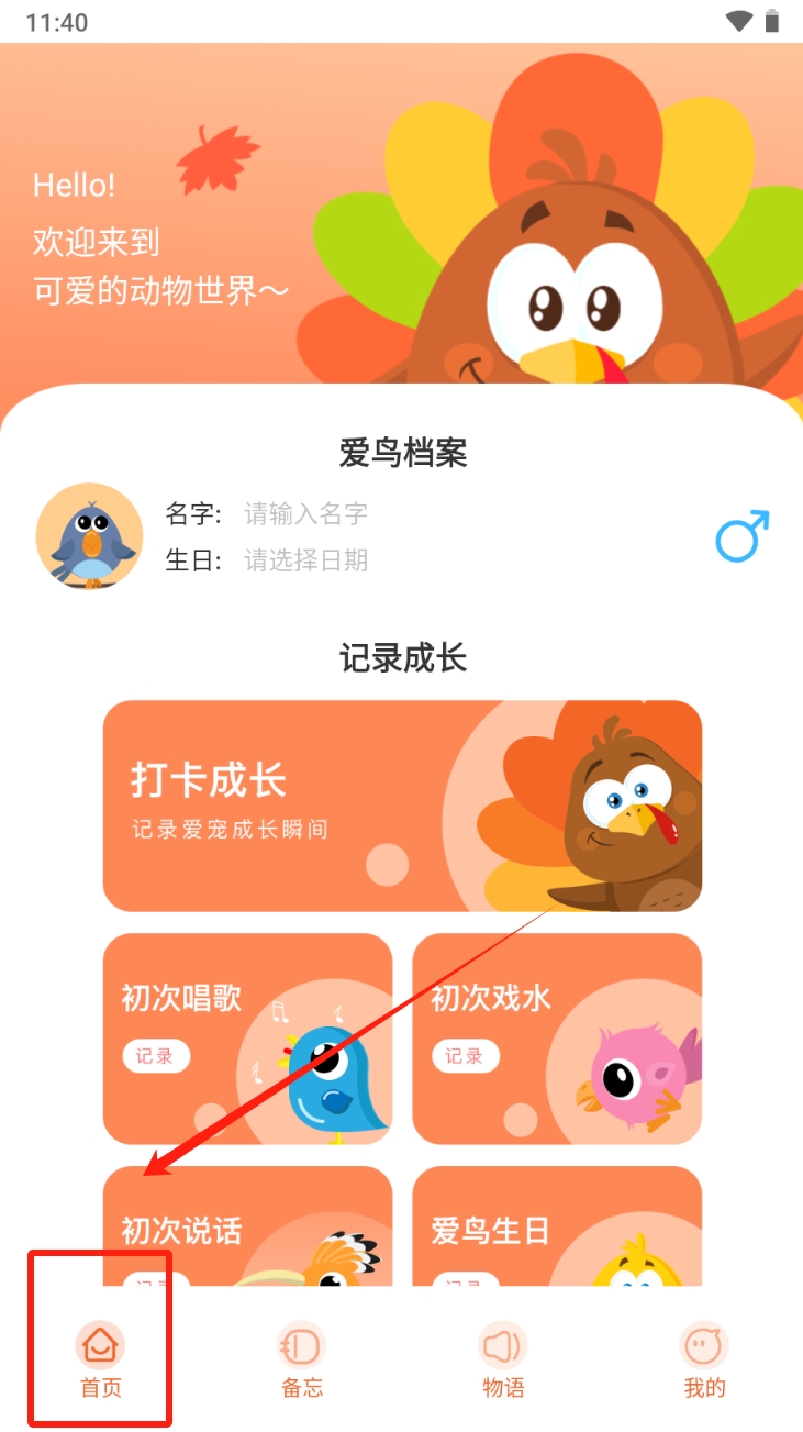 1、创建爱鸟档案。在首页点击“爱鸟档案”,输入宠物的名字和生日,开始记录您宠物的成长历程。