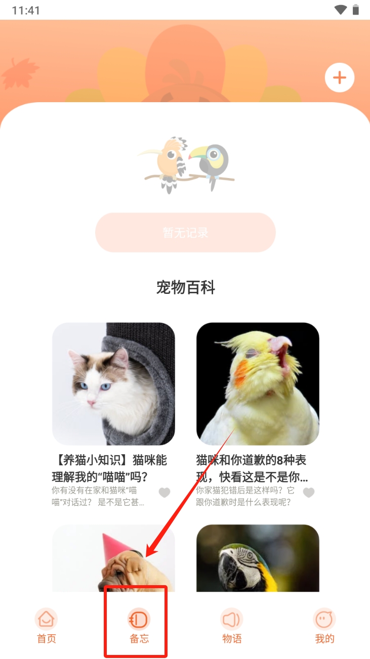 2、查看宠物百科。点击底部导航栏的“备忘”图标,进入宠物百科,了解更多关于宠物的知识。