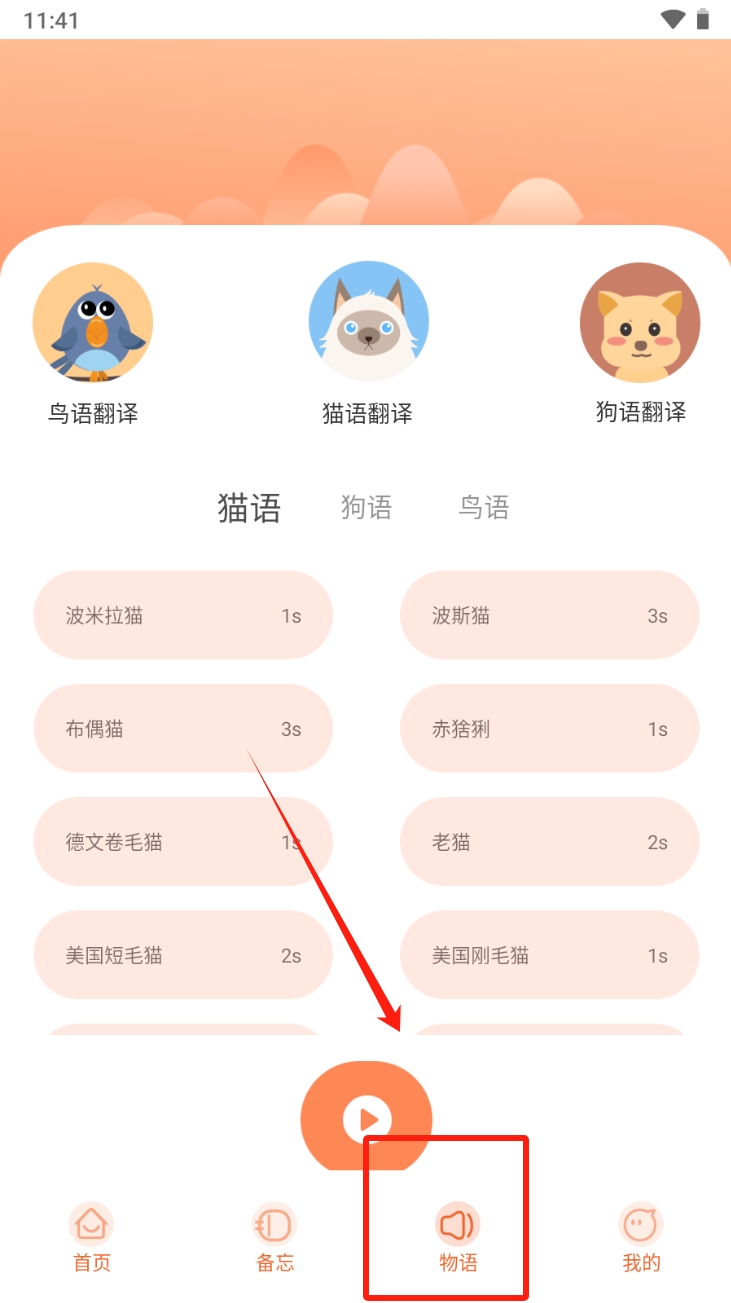 3、使用物语翻译功能。在首页点击“物语”图标,选择您想要翻译的动物语言,体验与宠物沟通的乐趣。