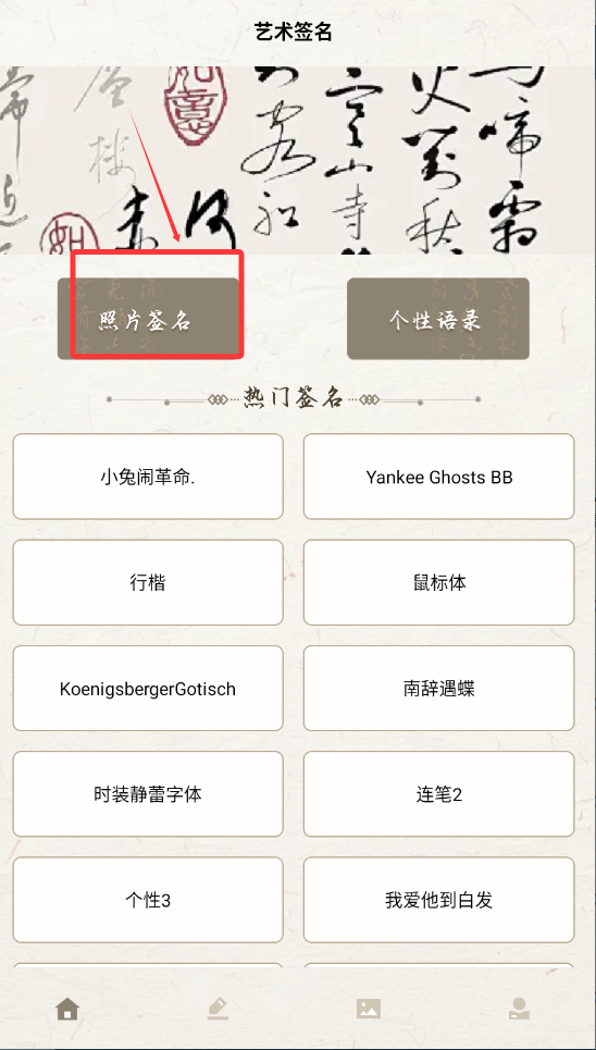 1、在首页点击“照片签名”,上传你需要创作的照片。