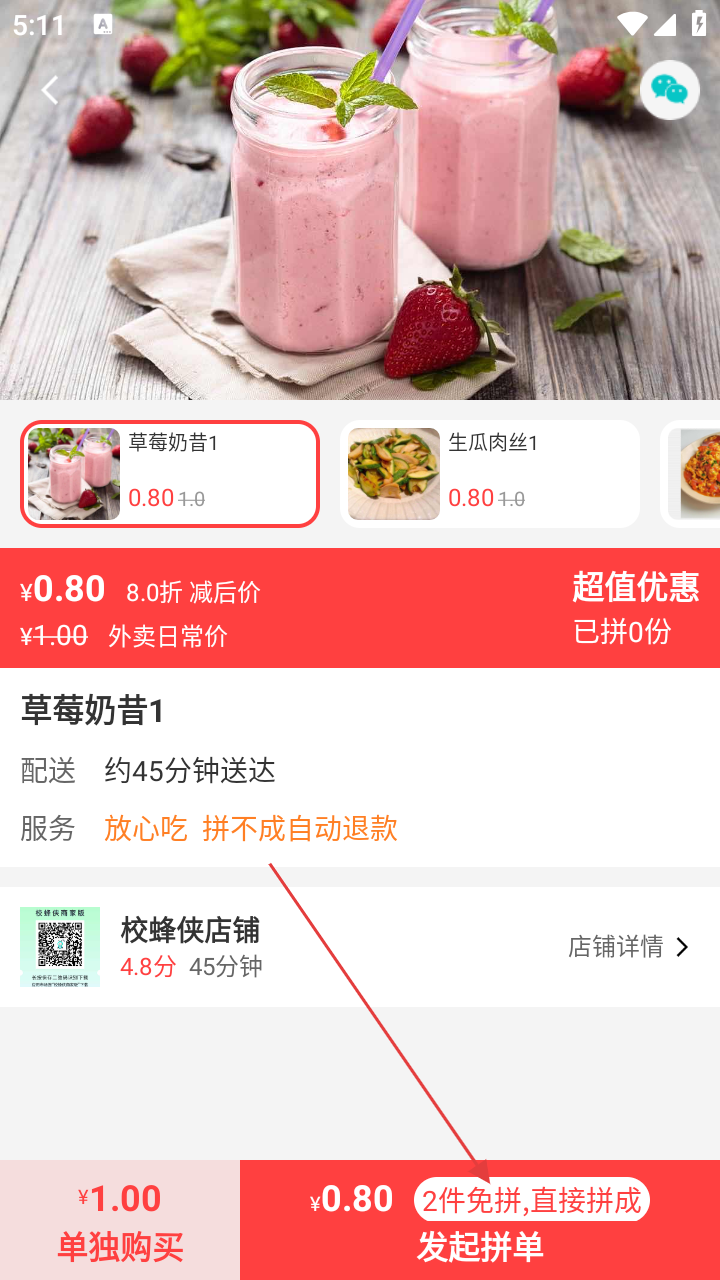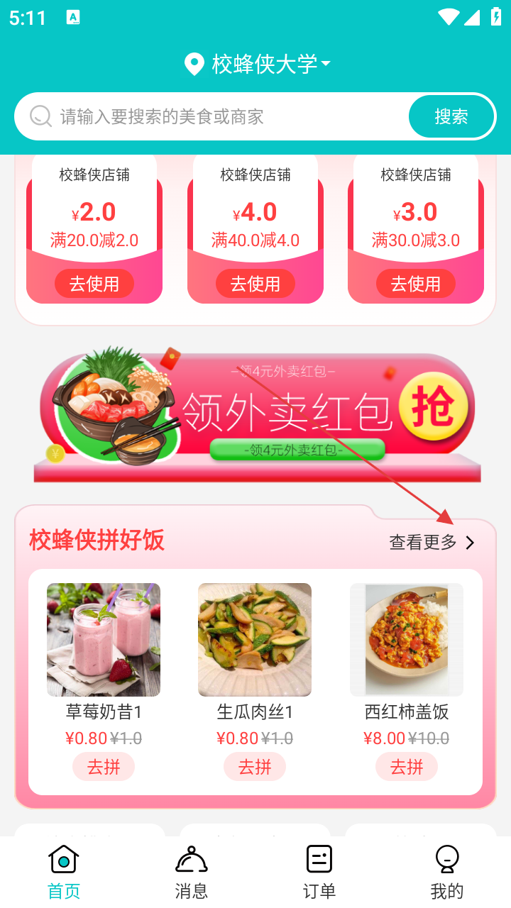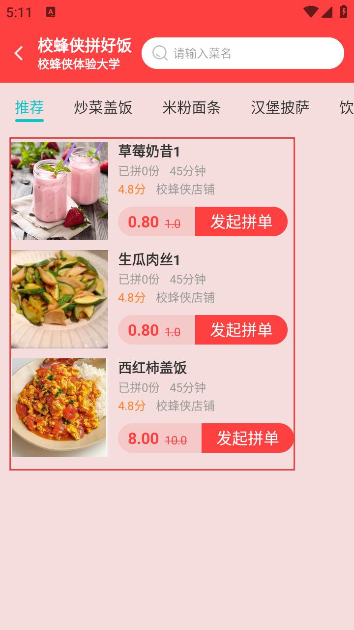 1、进入首页,找到【校蜂侠拼好饭】,点击【查看更多】,浏览拼单菜品。