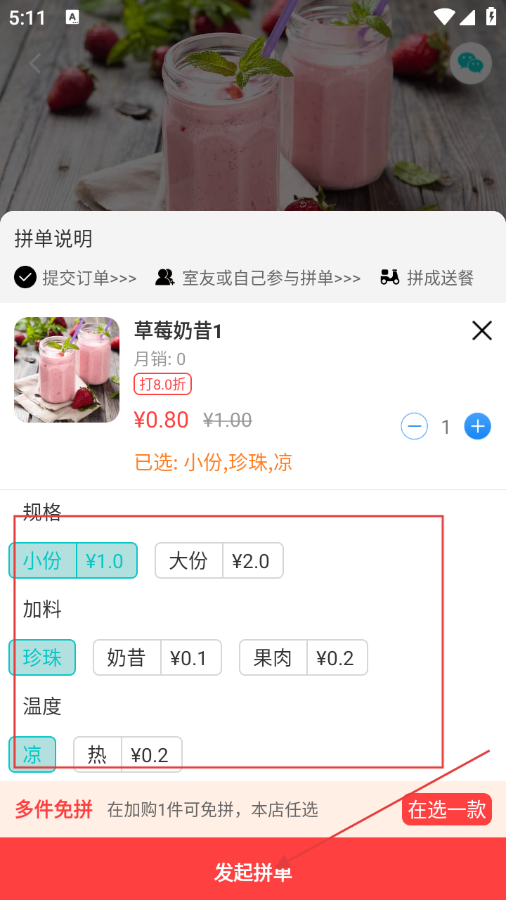 4、选规格、加料、温度,再选一款凑免拼,点【发起拼单】完成。