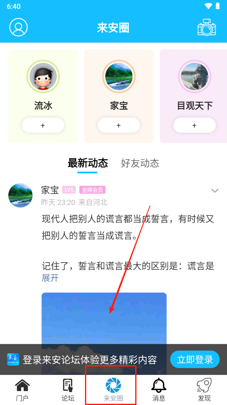 3、点击“来安圈”进入个人动态页面,查看好友最新动态,进行互动。
