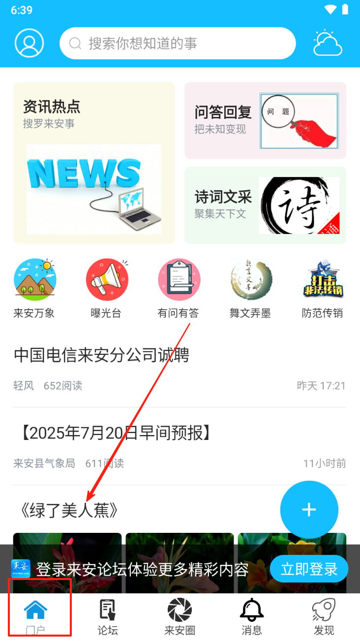1、在首页点击“门户”按钮,进入社区论坛,浏览资讯热点和各类板块。