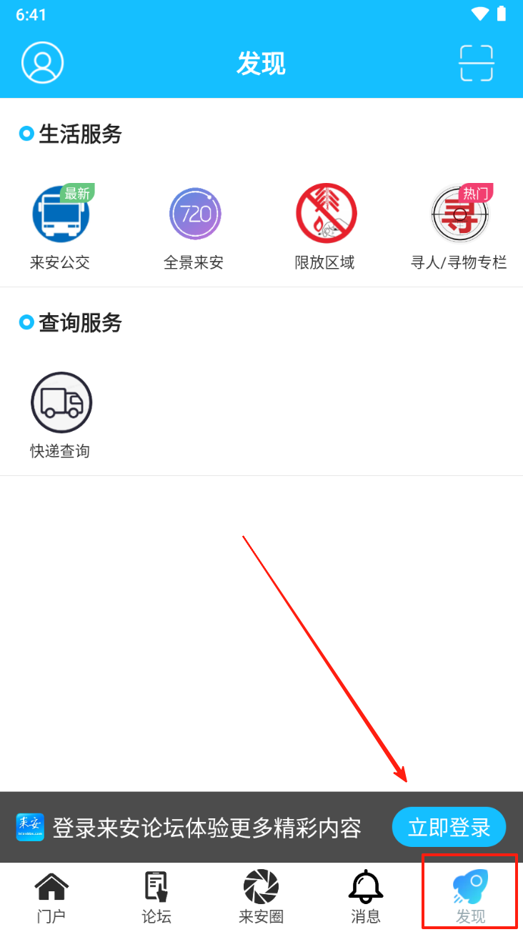 4、在“发现”页面,使用生活服务和查询服务,如快递查询等,获取更多信息。