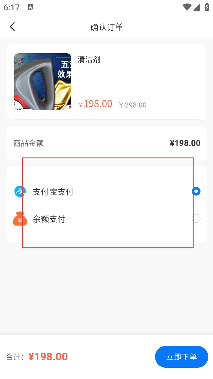 4、在确认订单界面,选择支付方式,选好后点击底部【立即下单】,按提示完成付款,即可成功下单该清洁剂。
