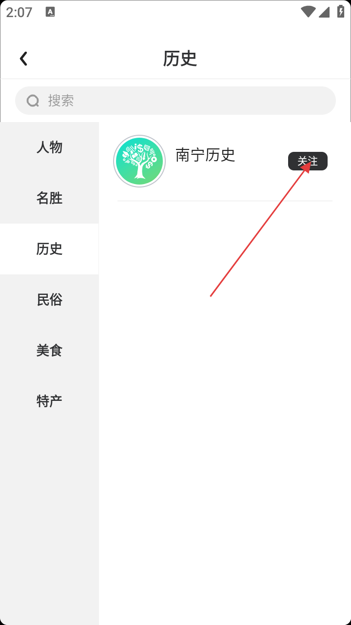3、在历史页,找到【南宁历史】,点右侧【关注】按钮。