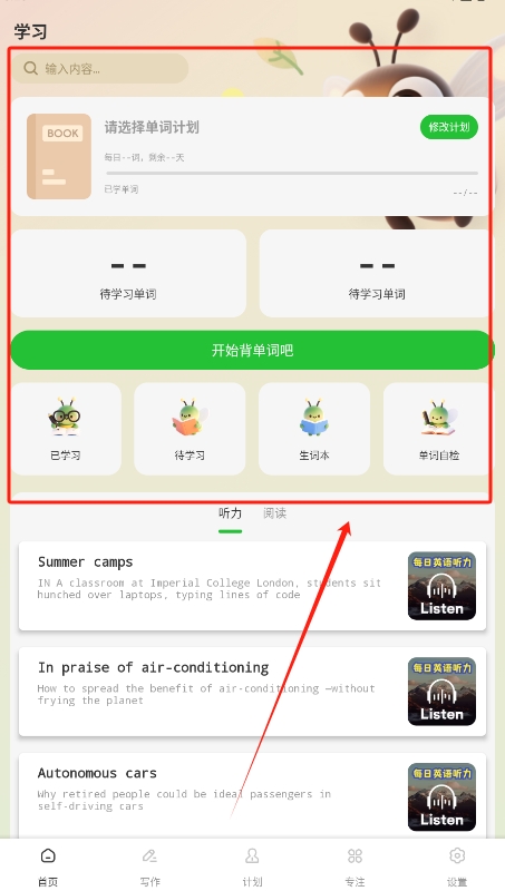 2、接着选择符合自身需求的学习模块,包括单词背诵,听力练习和口语互动,确保学习内容精准。