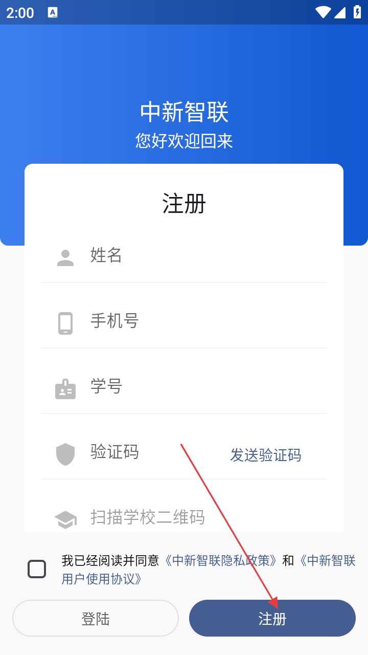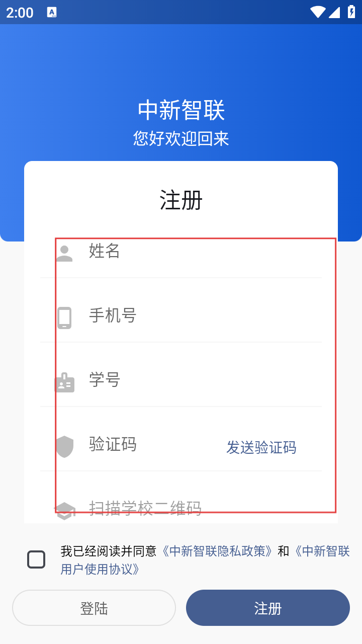3、进入注册界面,按要求填【姓名】【手机号】【学号】,点【发送验证码】并输入在对应的方框内。