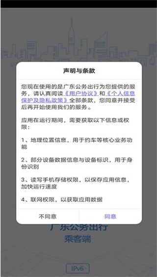1.启动软件并确认条款:打开广东公务出行 APP,在初始界面仔细浏览声明与条款内容,确认无误后,点击“同意”按钮,以继续后续操作。