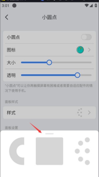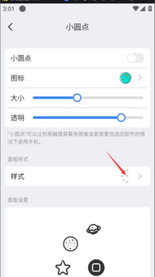 2.在设置功能里,用户能够对小圆点的大小以及透明度进行调节,同时还能点击相关选项来调整小圆点的样式。