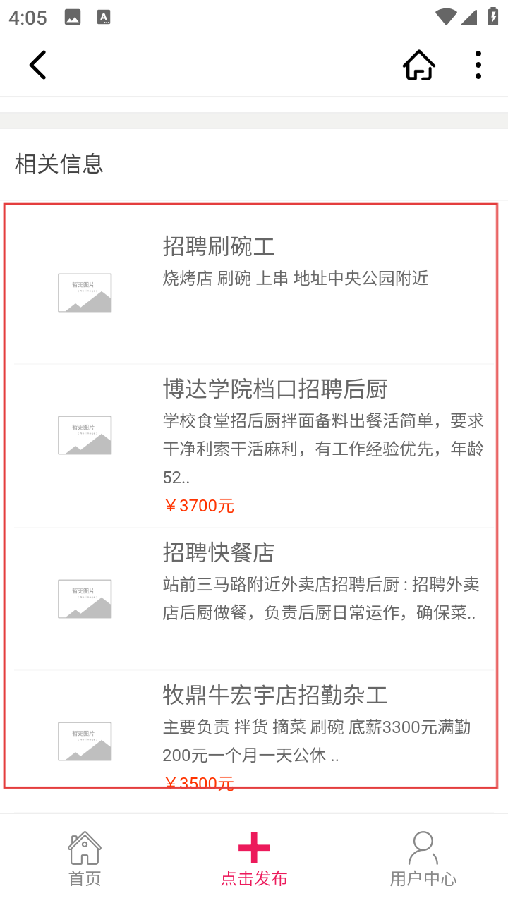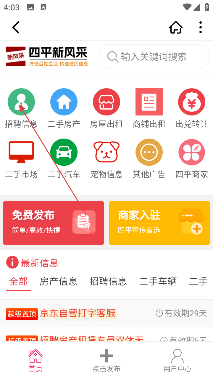 1、进入首页,点击【招聘信息】图标,查看各类招聘内容。