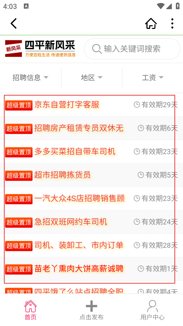 2、在招聘信息页,浏览【超级置顶】岗位列表,找感兴趣的。