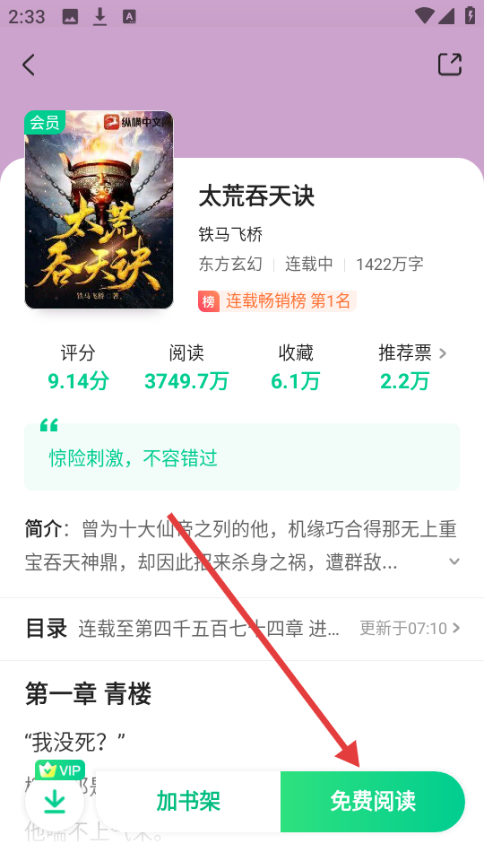 2、进入小说详情页后,点击【免费阅读】按钮,就可以开始阅读小说内容啦。