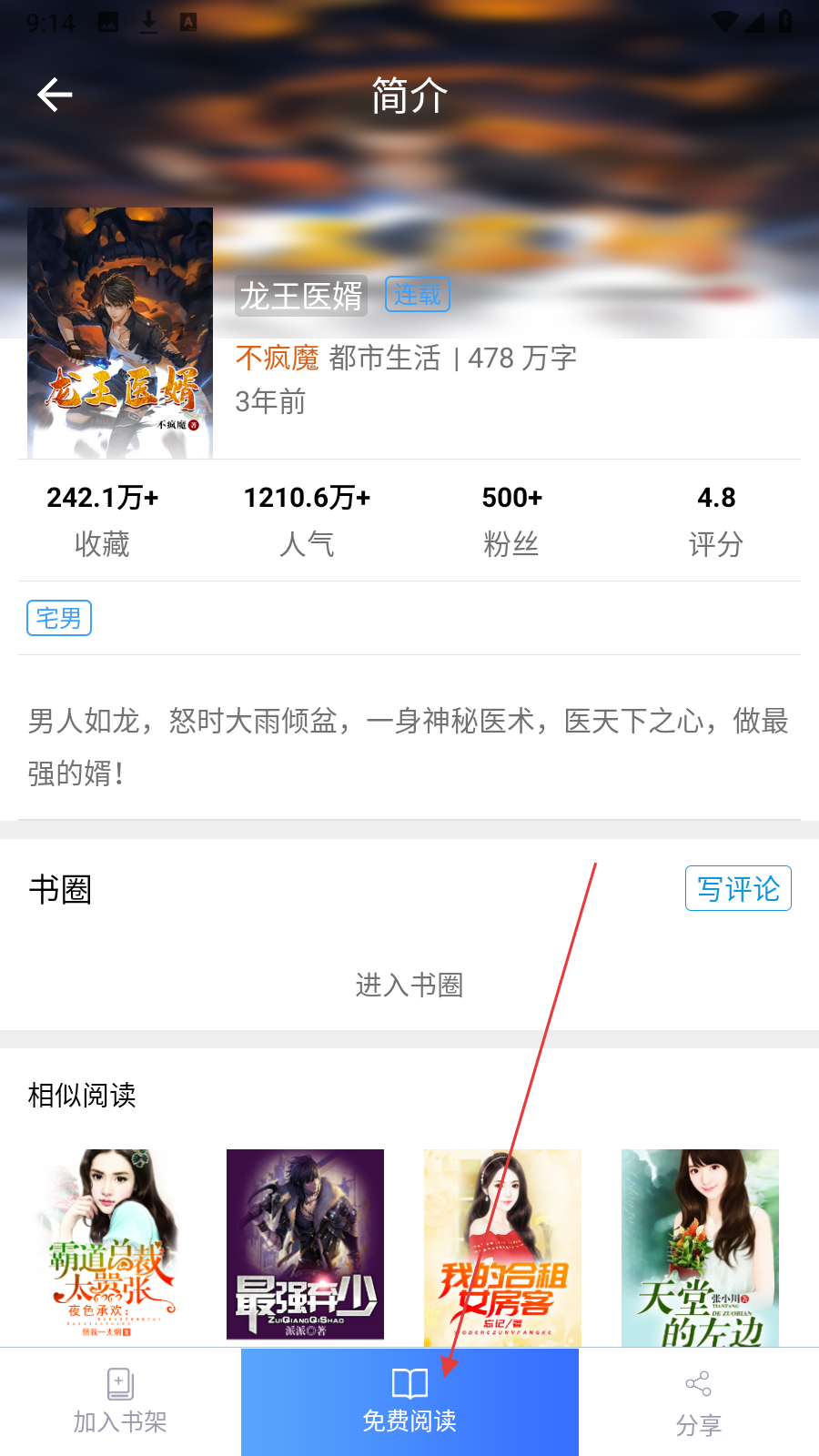 3、在详情页,点击【免费阅读】,开启小说阅读体验。