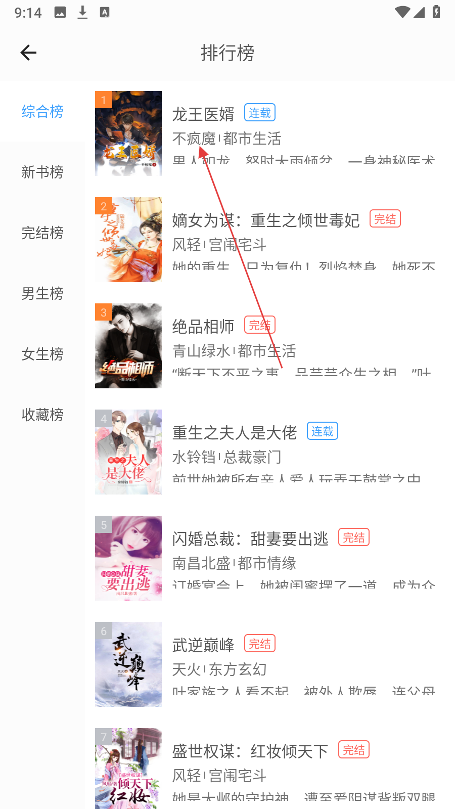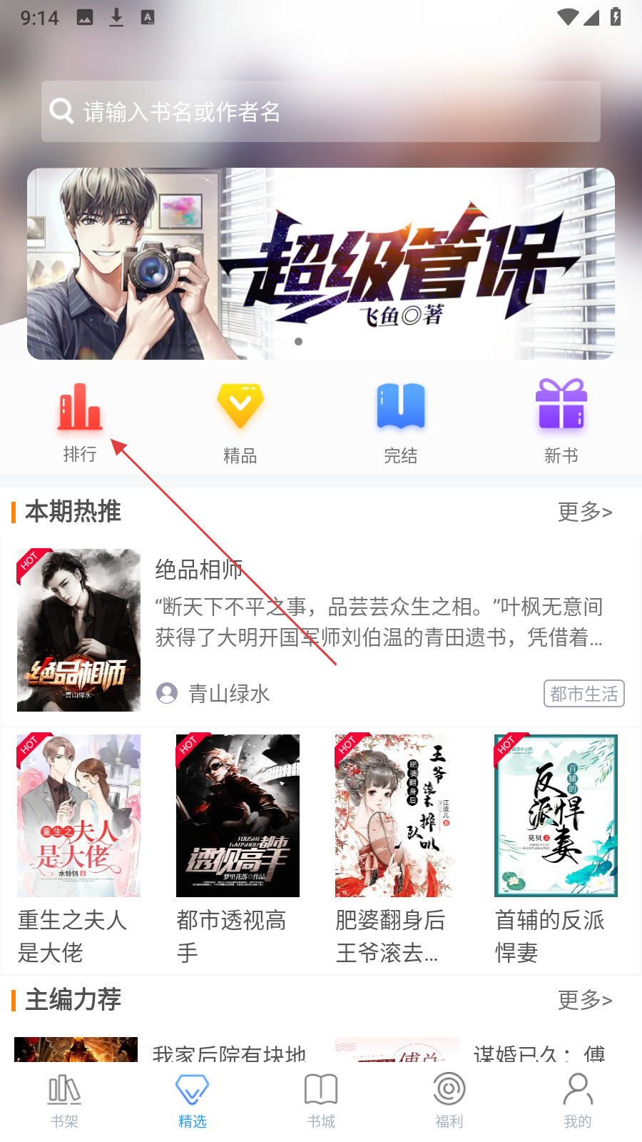 1、在精选页,点击【排行】,进入小说排行榜界面。
