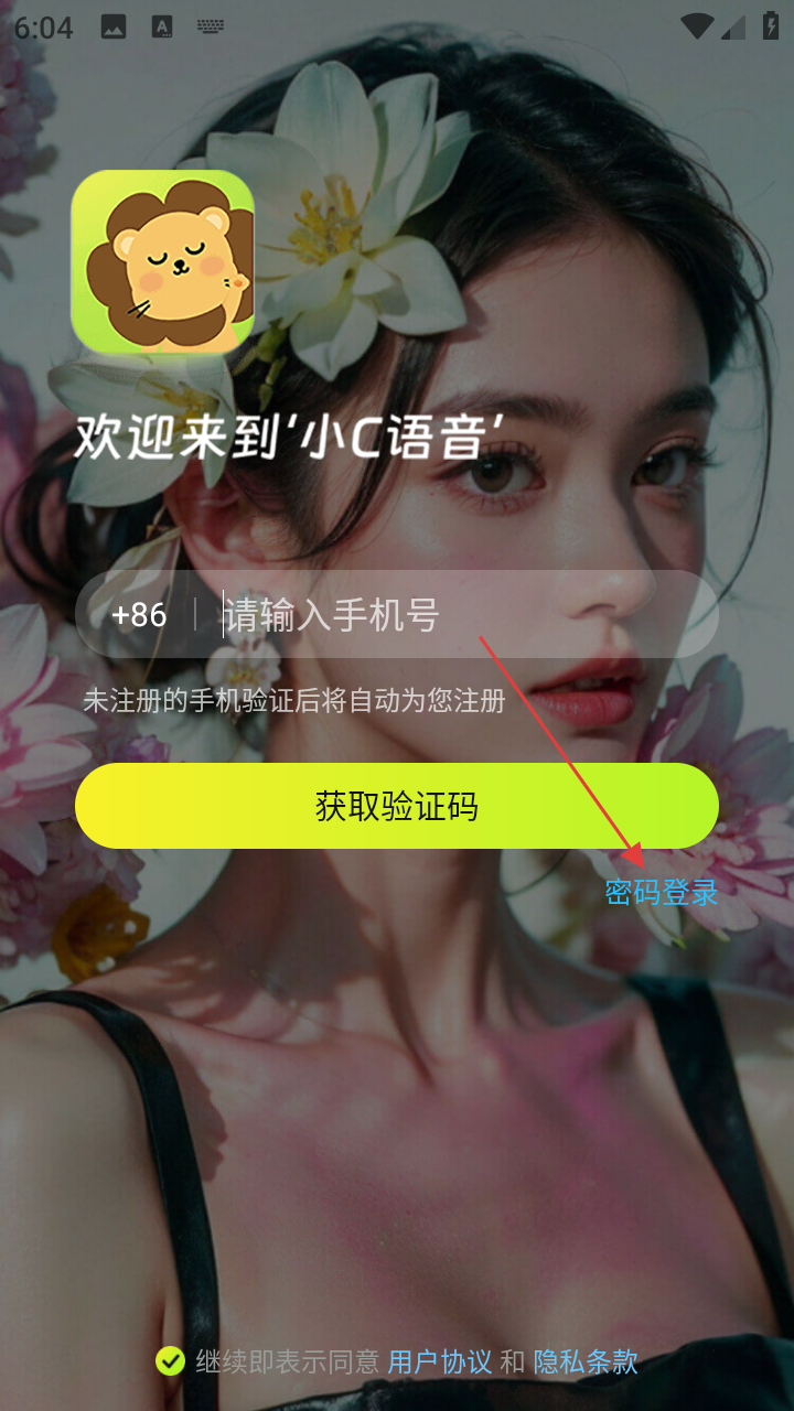 1、在“小C语音”登录页面,若选择密码登录,点击【密码登录】,进入密码登录页面。