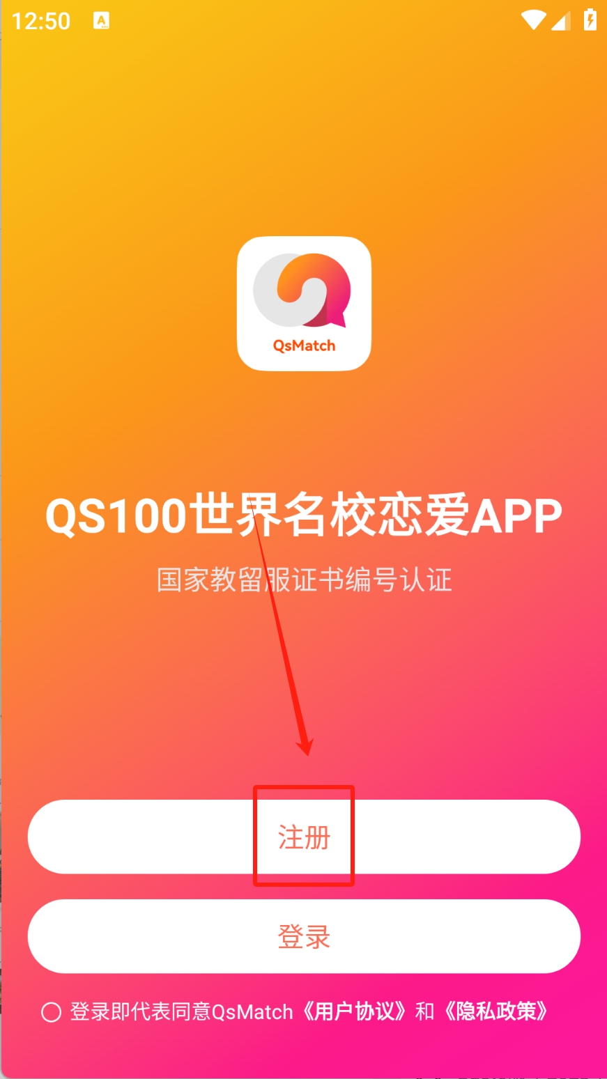1、打开QsMatch名校恋爱APP,点击注册按钮。这是开始使用QsMatch的第一步,点击注册后可以创建新账户。