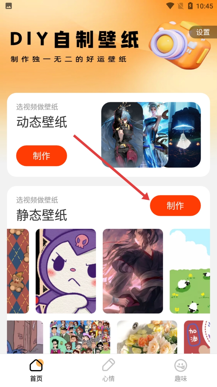 1、进入DIY自制壁纸页,选【静态壁纸】旁【制作】,开启壁纸制作流程。