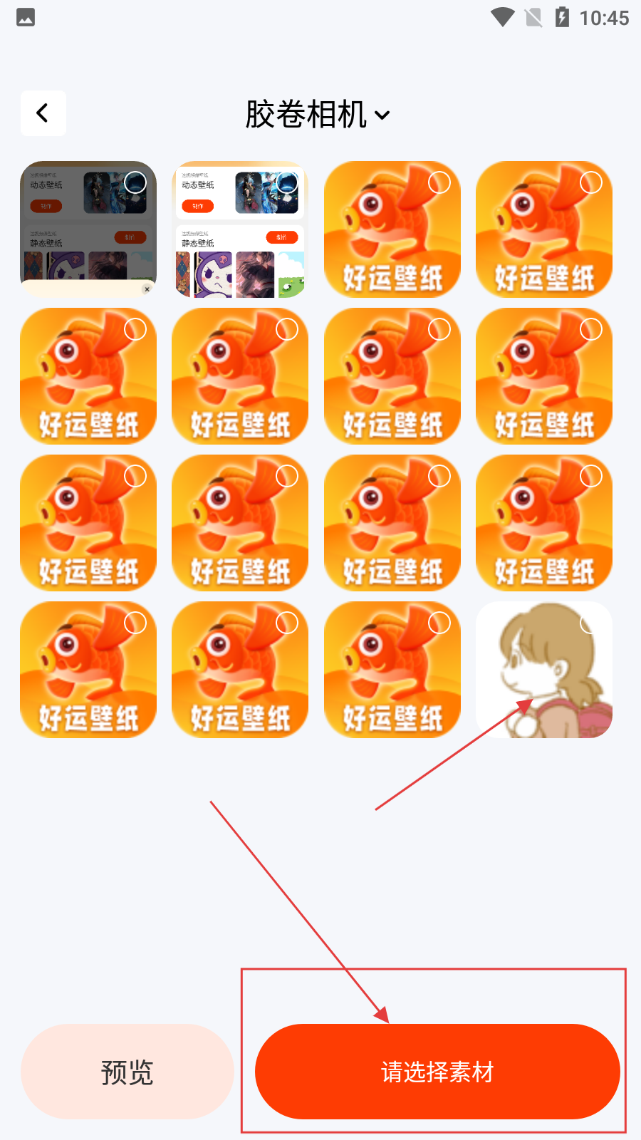4、选好素材后,点【上传素材】,将素材导入,就制作好壁纸拉。