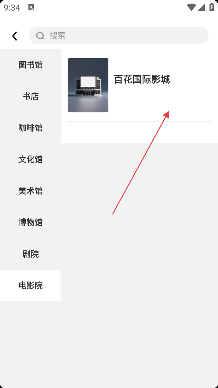 3、选【电影院】分类,点【百花国际影城】,了解影城详情。