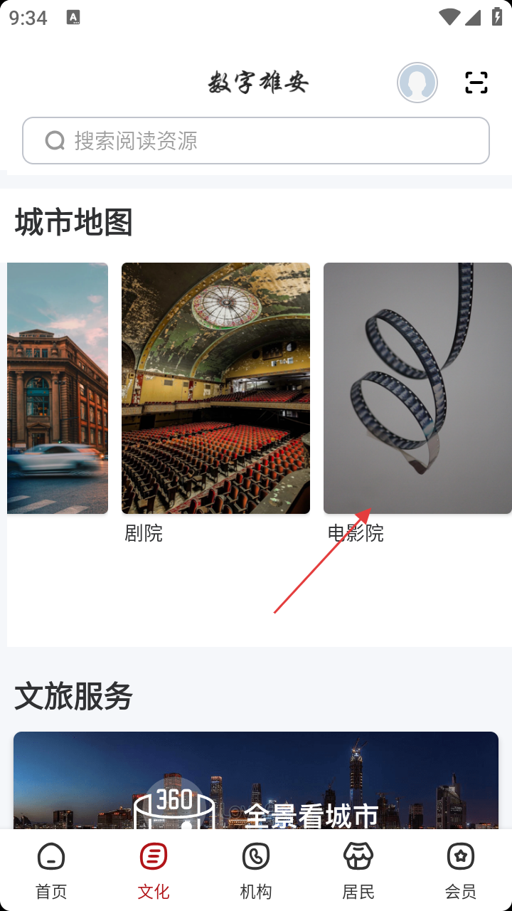 2、在【文化】页,点【电影院】,查看城市地图里的影院资源。