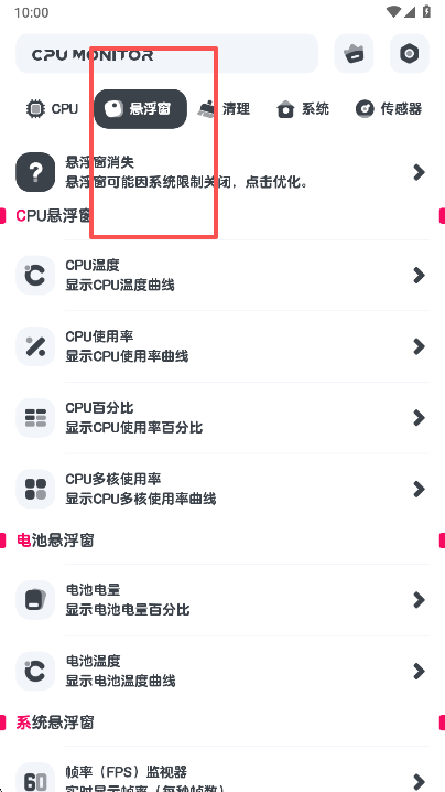 2、随后依据自身需求打开对应的硬件检测悬浮窗,并给予软件悬浮窗口权限就行。