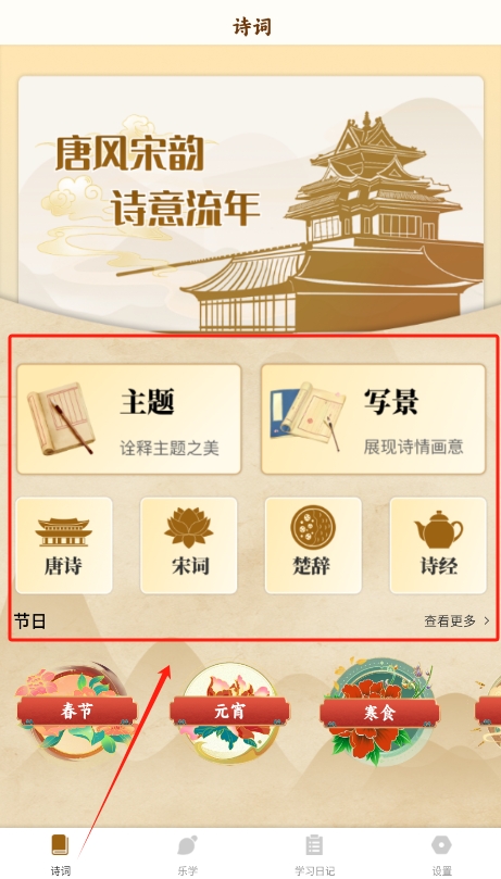 1、首先下载安装应用并注册账户,进入主页后可以方便地浏览各种诗词类别,开启愉快的诗词学习之旅。