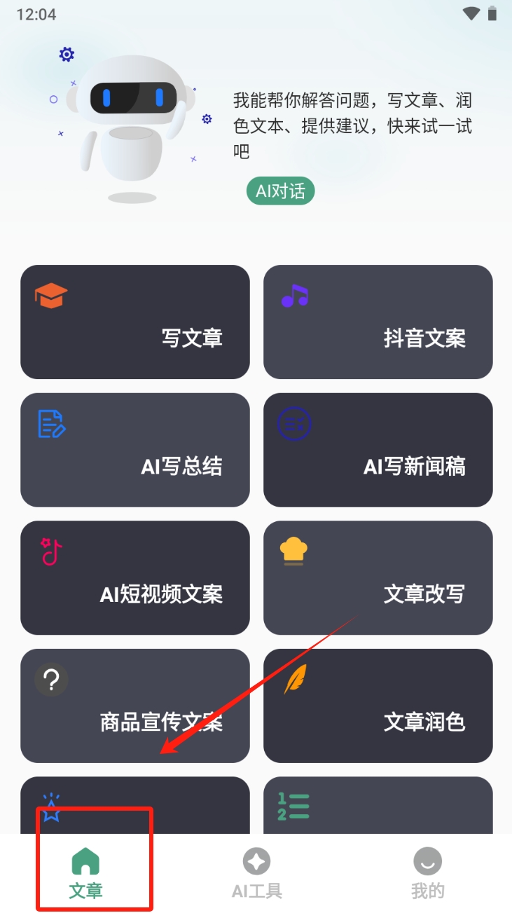 1、首先,进入文章创作界面。在主界面上,点击“文章”按钮,进入文章创作页面,这里可以进行各种类型的文章创作,如写文章、抖音文案等。
