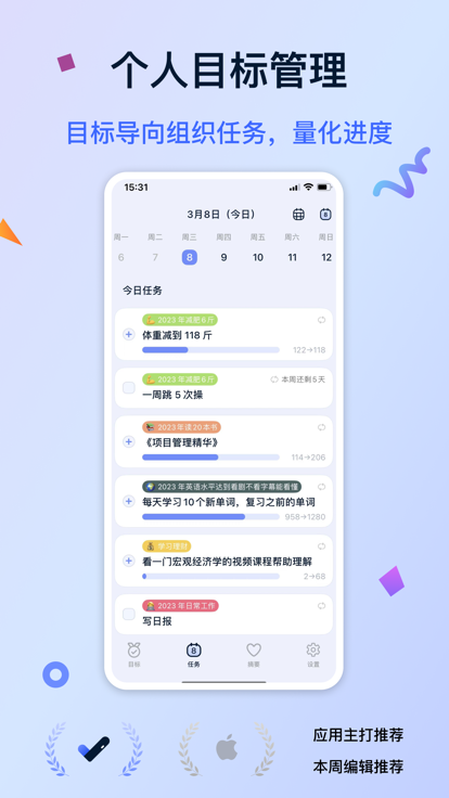 目标地图app下载是一款功能丰富的时间管理应用程序,旨在帮助用户有效地规划和管理时间。它提供了多种功能和工具,帮助用户设定目标、制定计划、跟踪进度,并提供实时提醒和报告,以帮助用户更好地利用时间,提高工作效率和生活质量。感兴趣的小伙伴赶快下载最新的软件版本吧。
