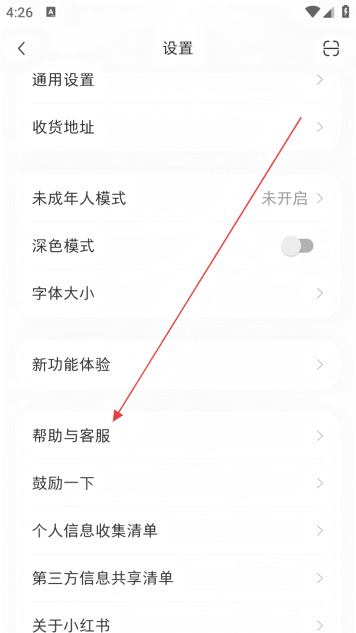 3、在设置页面,找到【帮助与客服】选项并点击。