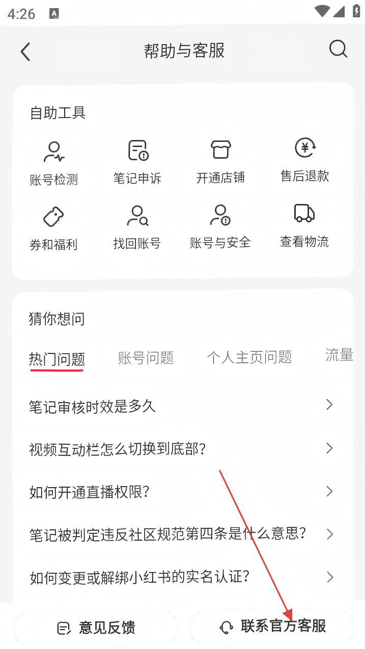 4、进入帮助与客服页面后,点击右下角【联系官方客服】,与客服沟通。