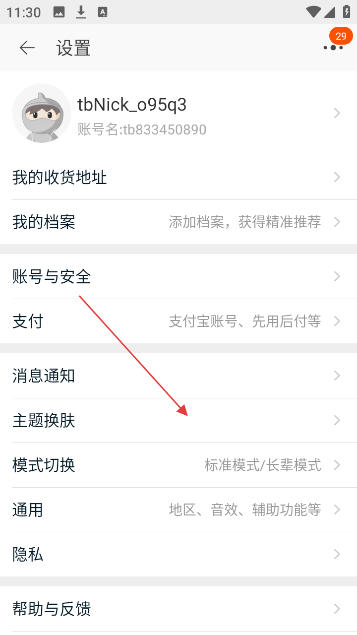 3、在设置页面,点击【主题换肤】选项,进入主题换肤页面。