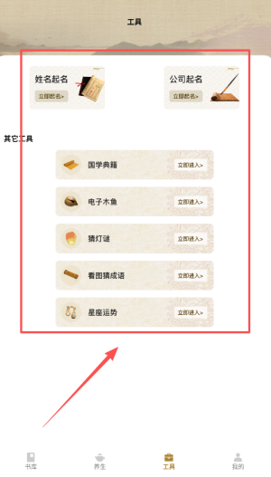 4、最后,完成阅读后,用户可随意使用内置的实用工具,如起名,猜灯谜等,拓展文化活动,增加生活趣味。