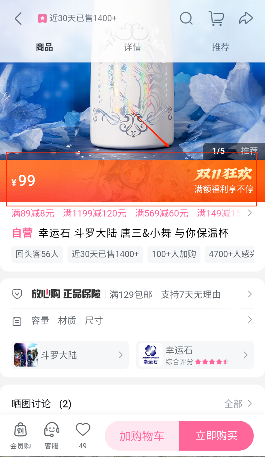 3、遇到促销活动时页面会有明显标识,比如双11狂欢期间可以享受优惠价格,还能参与抽奖活动。