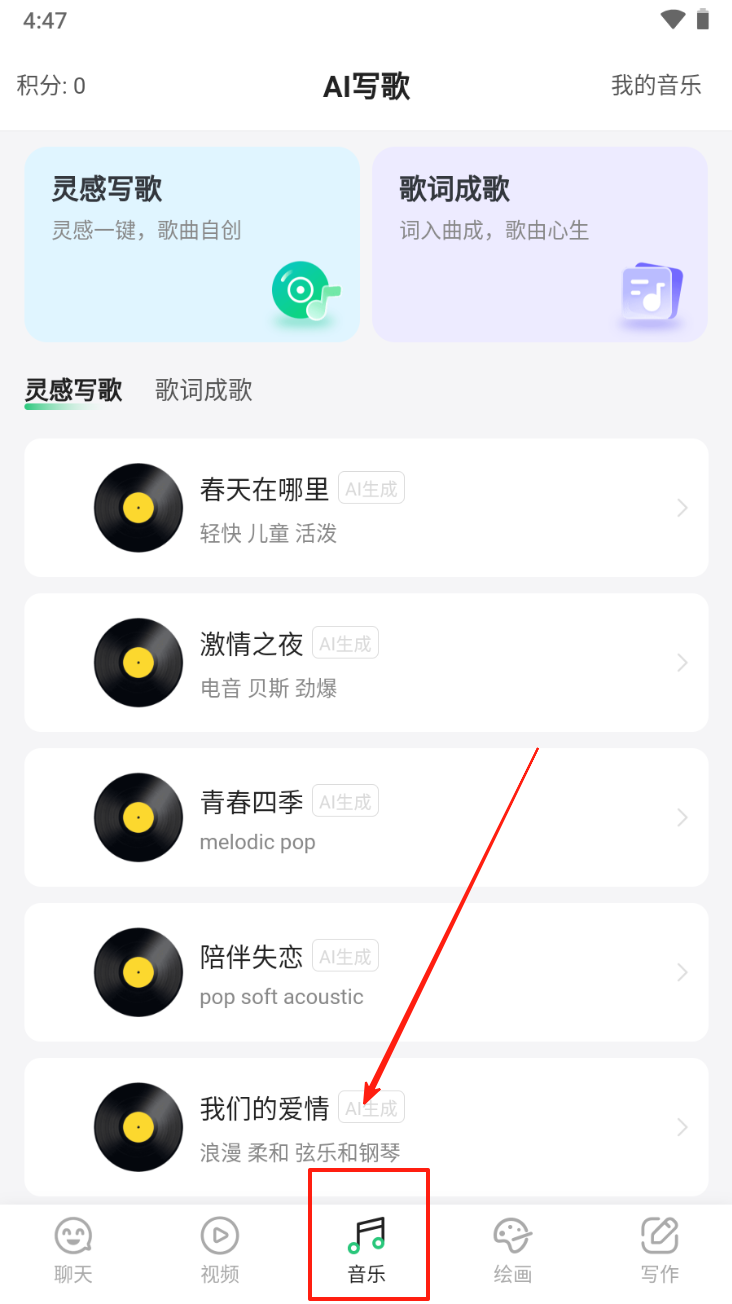3、选择“音乐”选项,利用AI创作属于你的原创音乐。