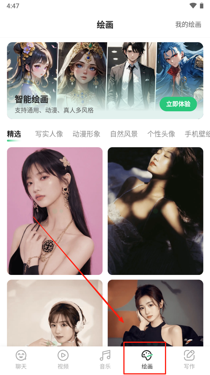 4、进入“绘画”界面,体验AI智能绘画的多样风格。