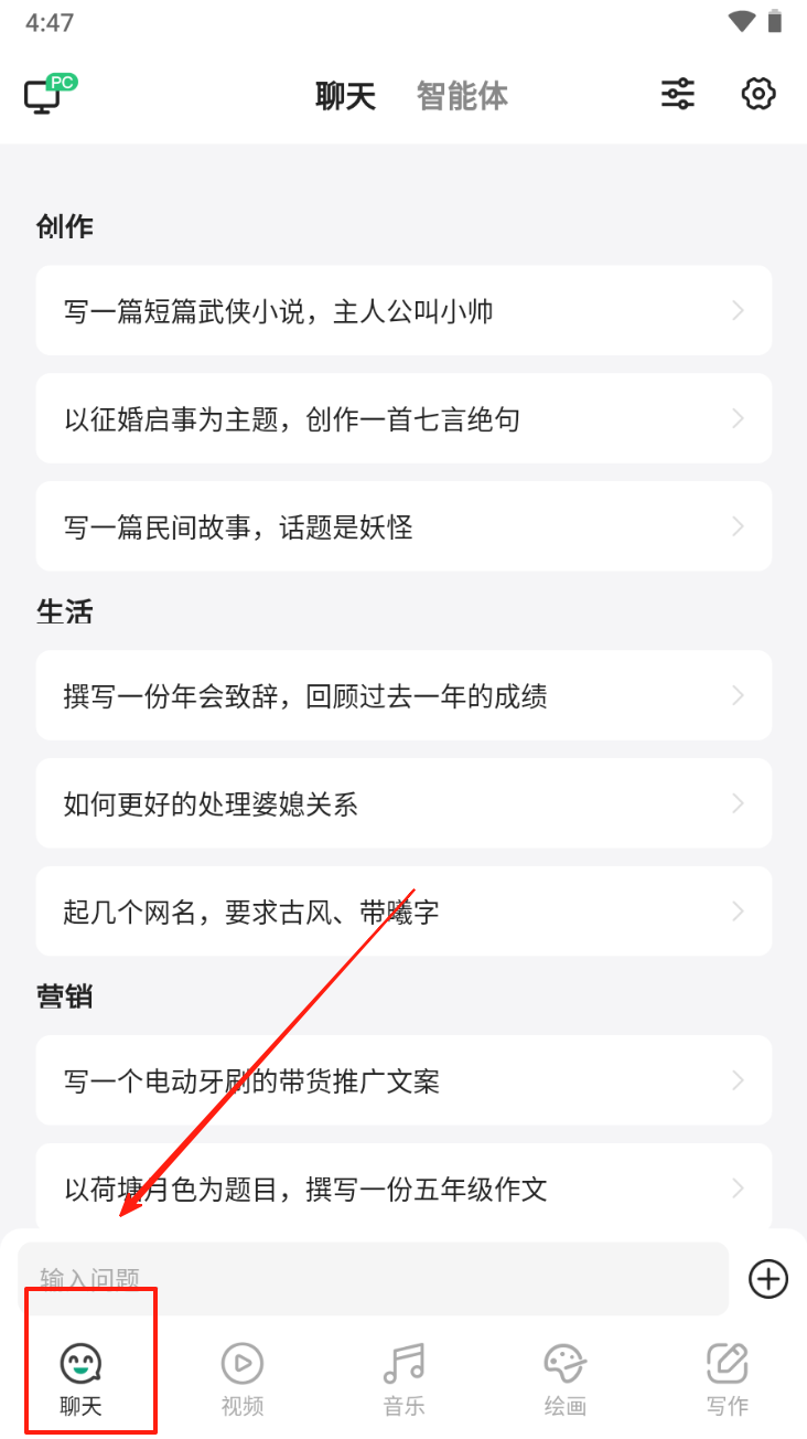 1、进入聊天界面,选择“聊天”选项,开始与AI互动。