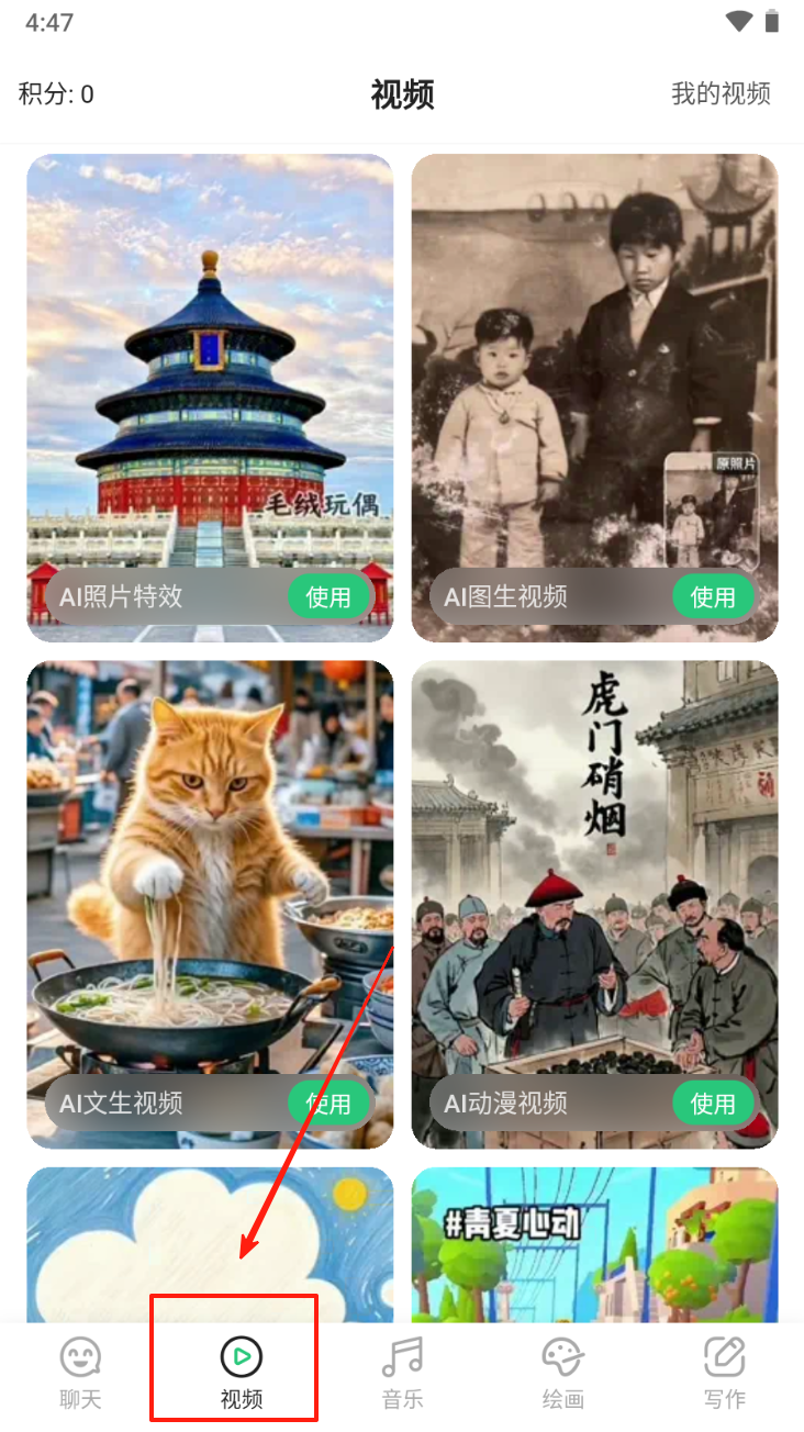 2、点击“视频”选项,探索AI生成视频的多种特效。