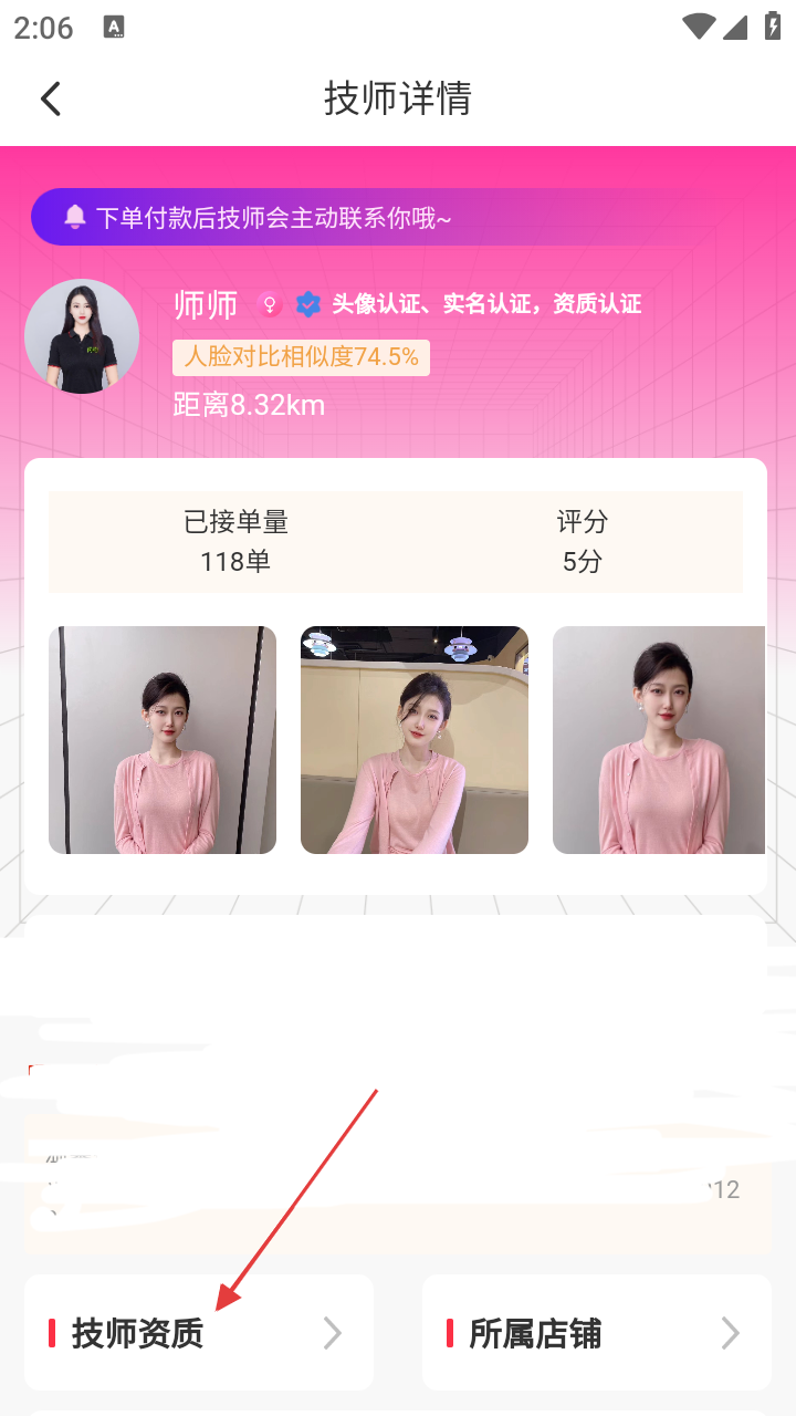 2、进入技师详情页,可查看技师已接单量、评分等信息,若要查看技师资质,点击【技师资质】。