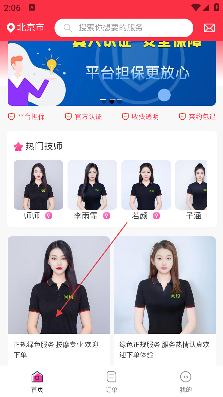 1、打开闲约到家上门按摩,在首页可查看热门技师,点击感兴趣的技师。