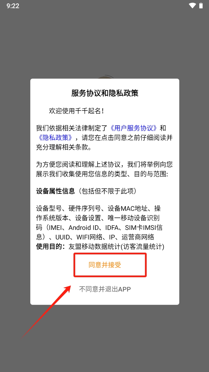 1、 打开 app ,弹出服务协议弹窗,点 “同意并接受” 进入。