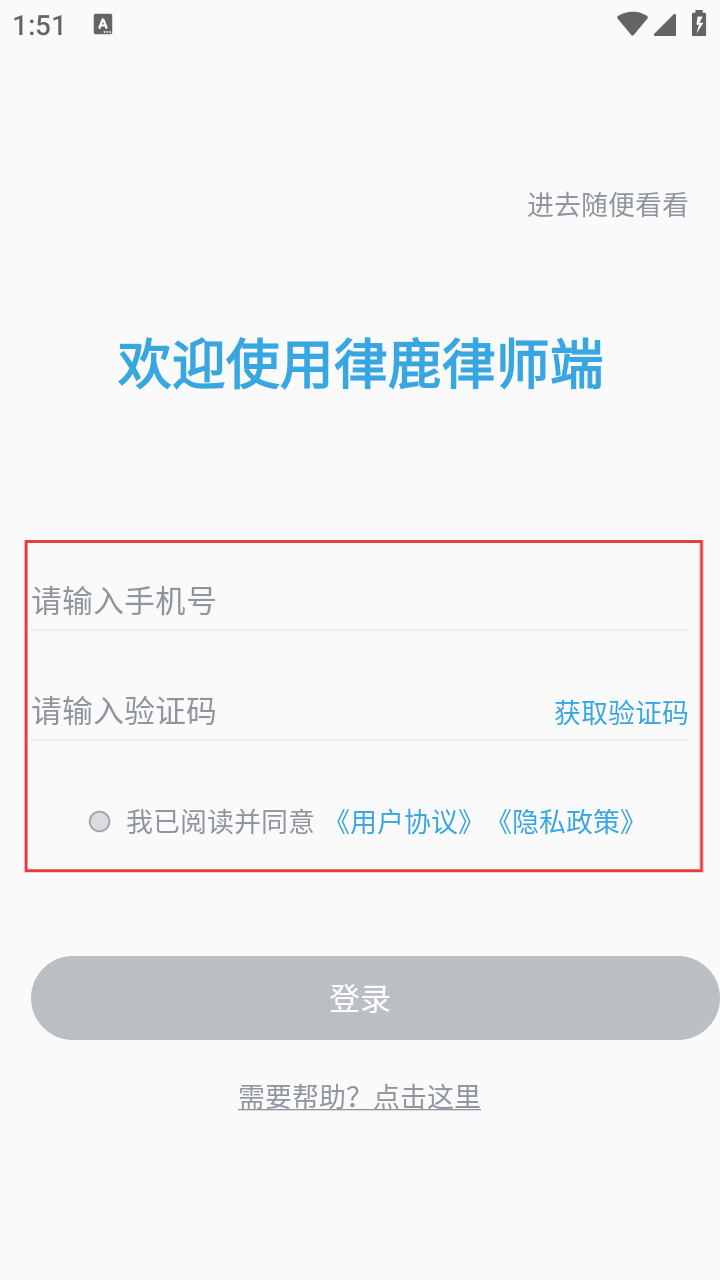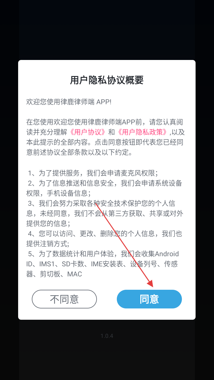 1、打开律鹿律师端,查看【隐私政策】点击【同意】,接受律鹿律师端条款。