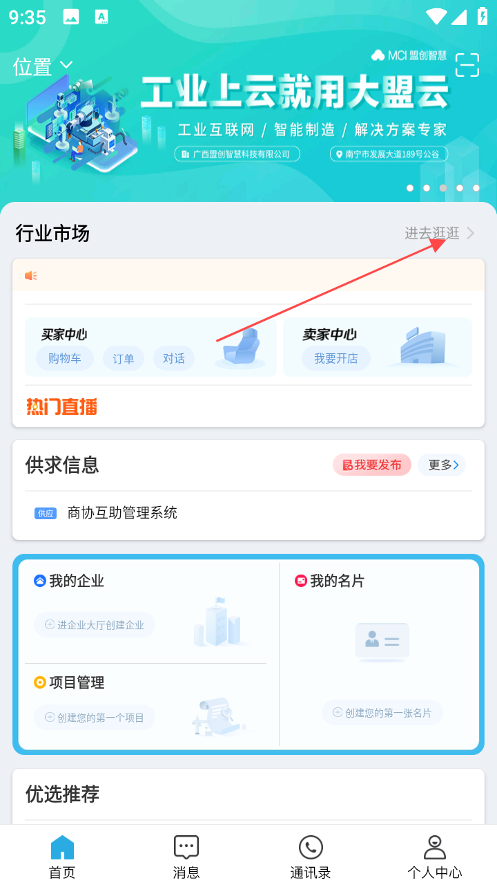 1、打开应用进入首页后,找到【行业市场】板块,点击右侧【进去逛逛】,可进入U建行业市场。