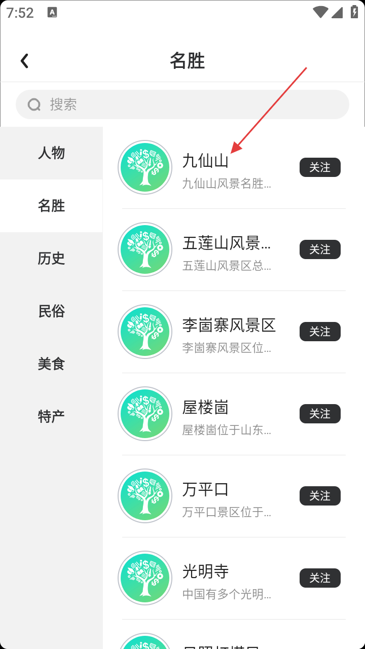 3、在名胜列表里,找到【九仙山】并点击,跳转至景区详情页,能看到九仙山的简介,还有苏轼相关典故等信息。