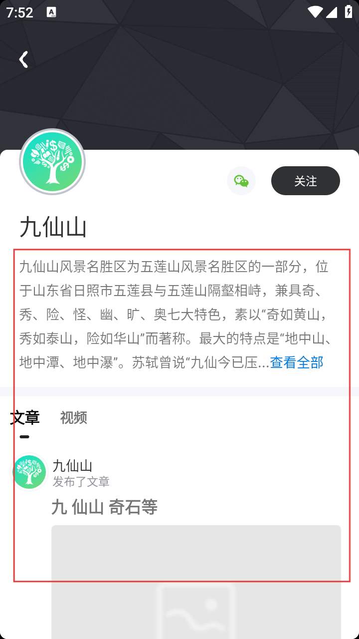 4、在九仙山详情页,通过切换【文章】【视频】板块,查看景区发布的内容。
