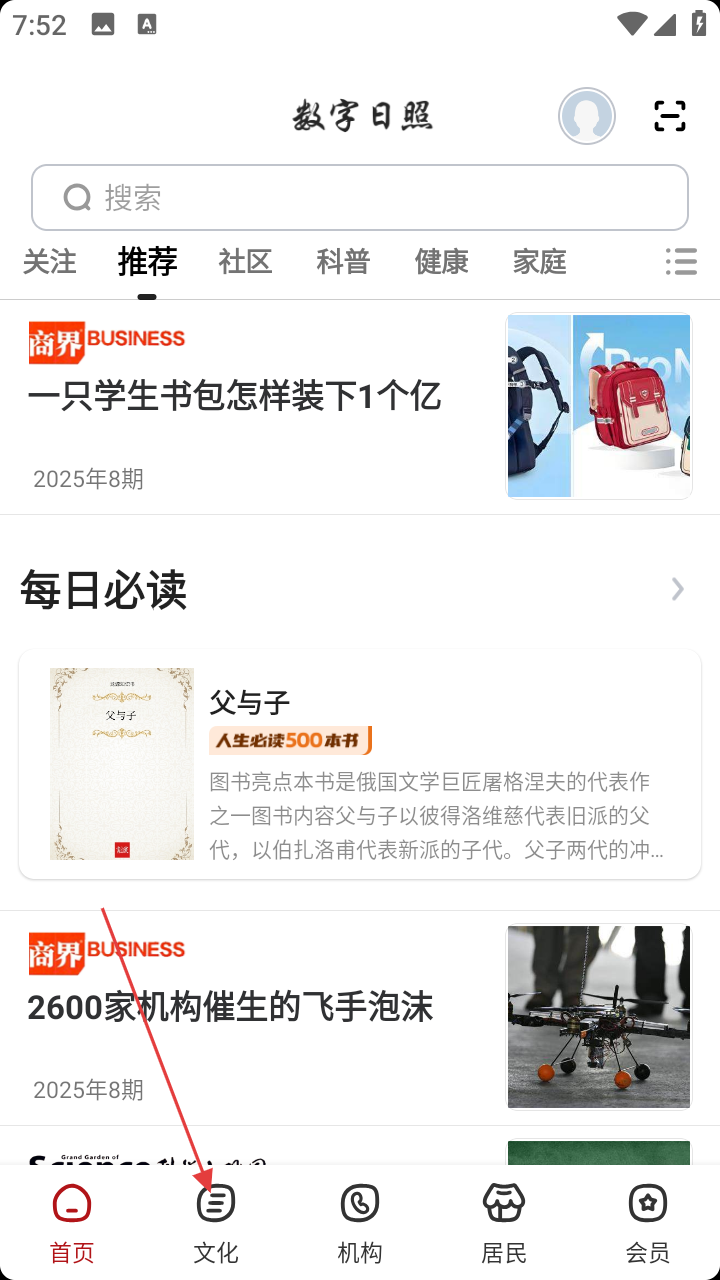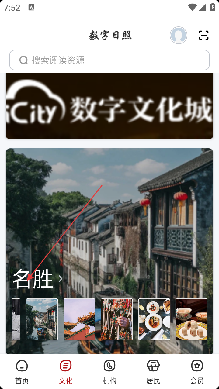 1、打开【数字日照】,进入首页后,在底部导航栏找到【文化】图标,点击它进入文化服务页面。